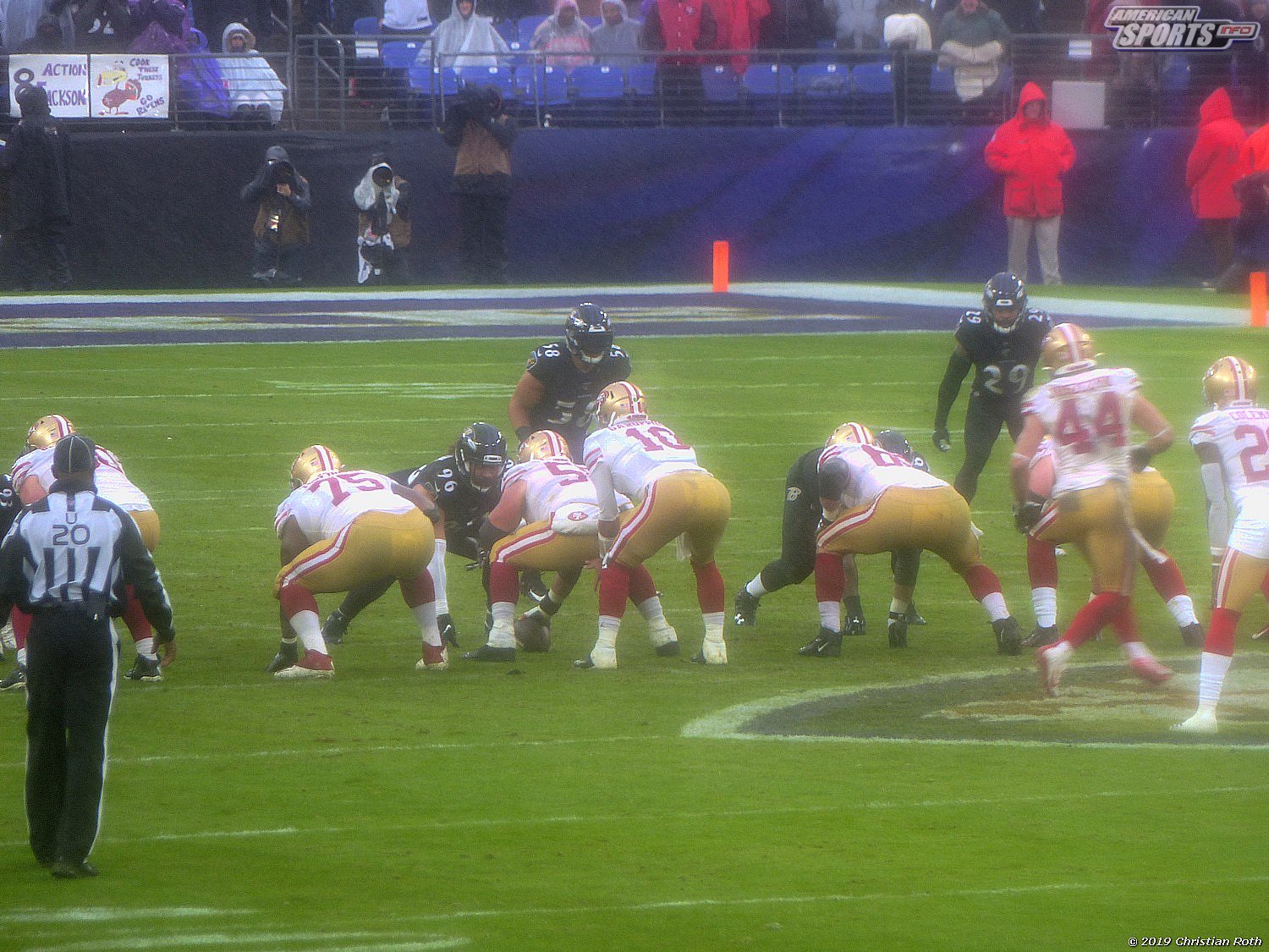 Finaler Spielzug der 49ers. 4Th & 1 an der BAL 35. Alles geschah bis zum Snap gefühlt in Zeitlupe. Die Lines stellten sich auf. Jimmy G positionierte sich zwischen seinen RBs. Der Snap kam. Wieder normales Tempo. Die Lines treffen aufeinander, Garoppolo wirft, Wormly blockt, wir eskalieren!