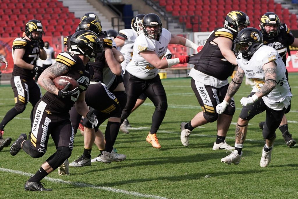 Klare Sache für die Krefeld Ravens. Gegen Die Münster Blackhawks, den Absteiger aus der zweiten Football Bundesliga GFL2 gelang den Seidenstädtern dank einer starken zweiten Halbzeit ein überzeugender 38:13 Heimerfolg. Unsere Bilder aus der Krefelder Grotenburg.